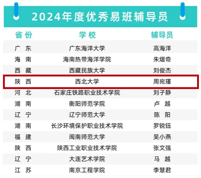 近日,教育部易班发展中心公布了2024年度全国易班共建优秀名单,由我院辅导员蔡一璇申报的案例《E声聚能|以高效多维融媒体传播矩阵赋能网络思政,创新网络育人实践》获评“2024年度全国优秀易班共建案例”;我院辅导员周宛瑾获“2024年度全国优秀易班辅导员”称号;我院辅导员韩钰获评“2024年度全国优秀易班指导教师”。