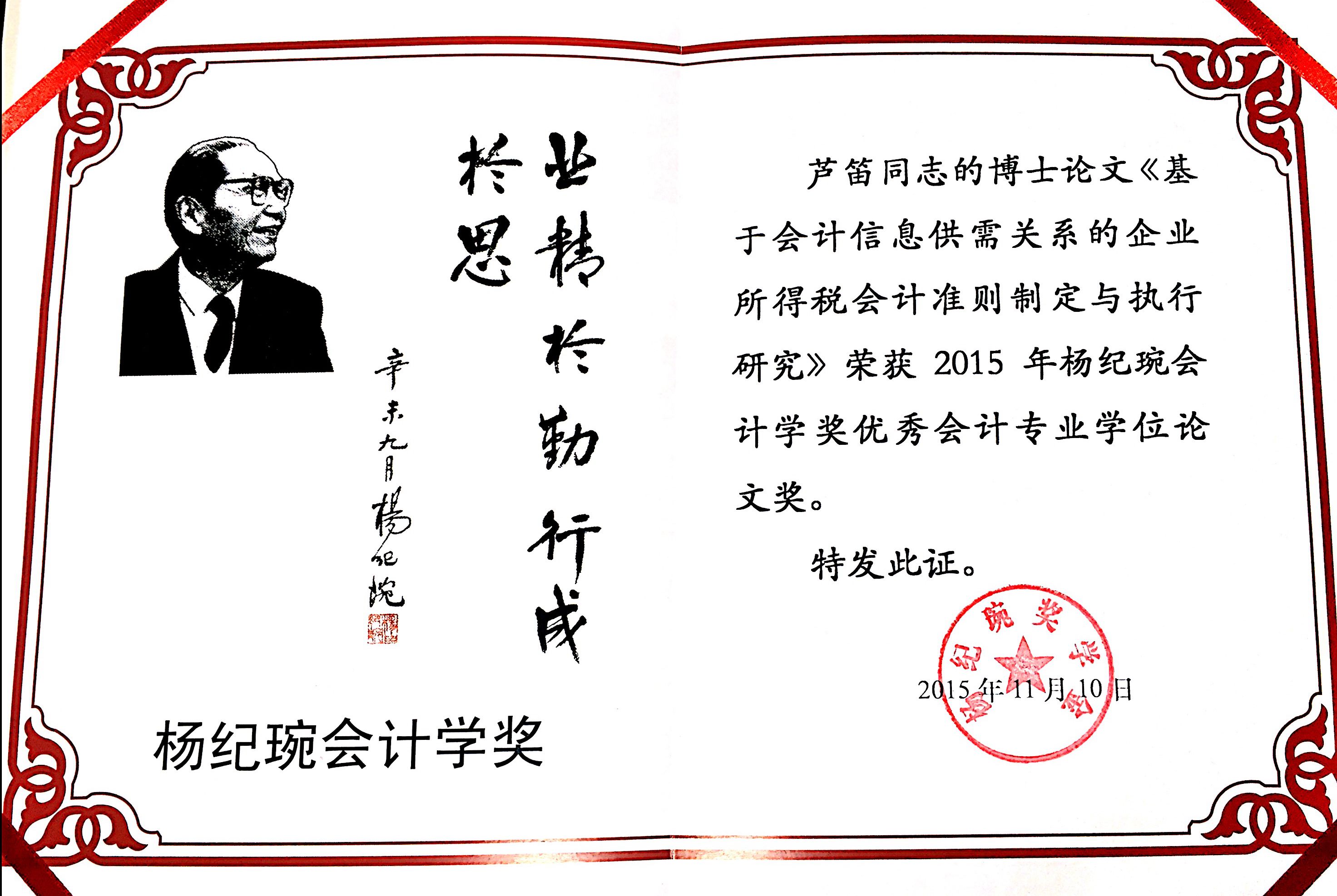 据悉,杨纪琬会计学奖于2002年经财政部审批设立,是中国会计学界的最高奖项,也是中国会计领域的第一个全国范围奖学金,至今已举办七届。2015年“第七届(2015)杨纪琬会计学奖”在全国范围内共评选出优秀博士学位论文3篇,优秀硕士论文3篇,优秀专著2部。本次评选活动中,我校首次获得该奖项。