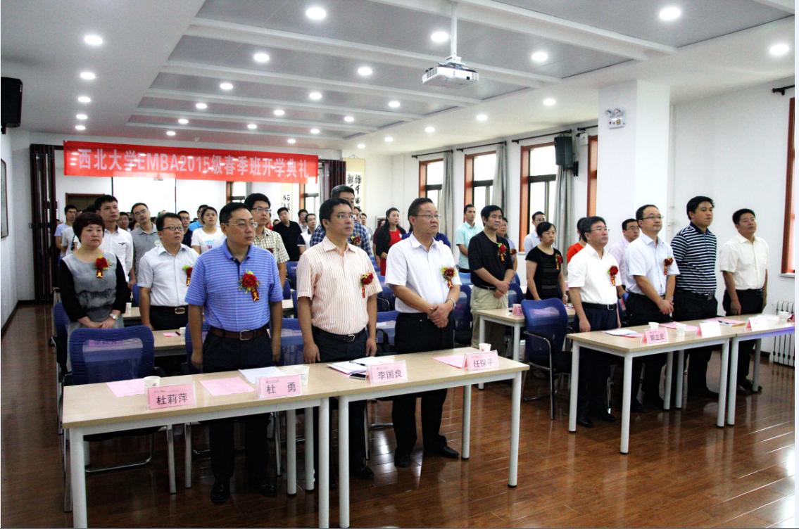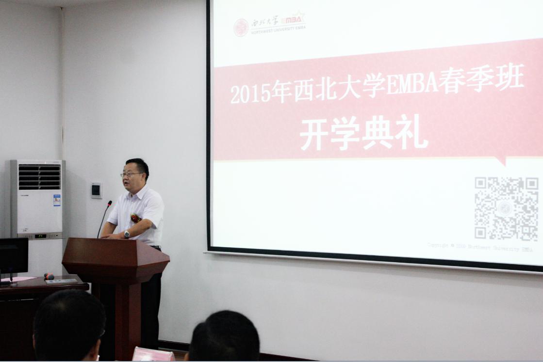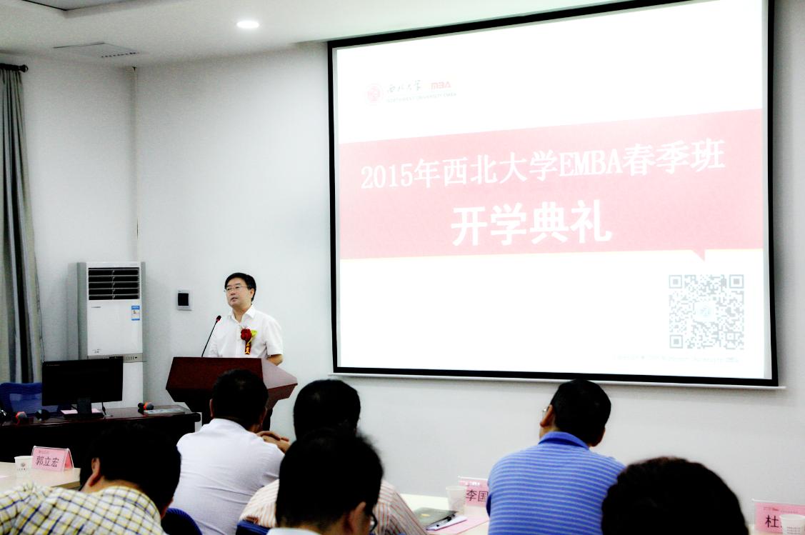 近日,西北大学2015EMBA春季班开学典礼在太白校区隆重举行。校长郭立宏教授,校研究生院副院长李军,经管学院党政班子成员、各系(各中心)主任、院长助理、老师代表和各教学点负责人出席了活动。典礼由EMBA中心主任杜丽萍主持。