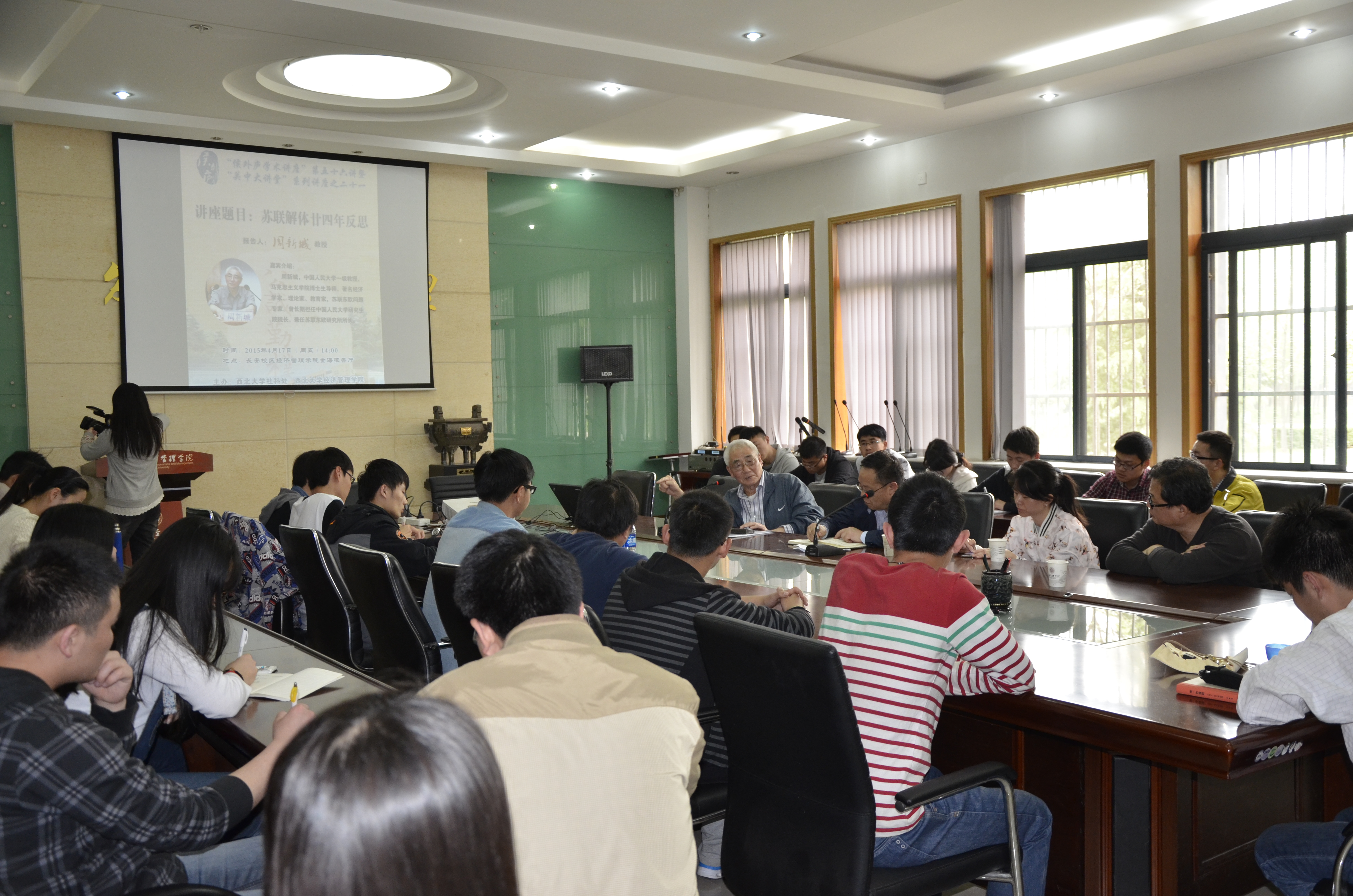 周新城教授指出,当前学术界关于苏联解体问题存在的争议,大体上概括为:一个价值判断,即“苏联演变是好是坏”;二个焦点问题,即对“苏联社会主义实践”和“戈尔巴乔夫改革”如何认识;对三大历史人物的评价,即对斯大林、赫鲁晓夫和戈尔巴乔夫如何评价;以及一个落脚点,即中国应该从苏联演变中吸取什么教训。他说,苏联解体的性质是一场民主派、西方敌对势力和党内民主社会主义力量三方合力夺取政权的和平演变,过程先后分为四个阶段:制造舆论,否定成就,政治动乱,夺取政权。关于苏联解体的原因,需要实事求是,全面的看待问题,要分清主流和支流,从外部原因来看,是西方敌对势力的和平演变。从内部原因来看,一个是社会主义建设中存在问题;从历史辩证地来看苏联社会主义实践,成绩是主要的,问题是次要的;要坚持社会主义方向,高度集中计划经济体制在特定历史时期曾经发挥过一定作用,后来不能适应生产力的进一步发展,这是客观存在的现实问题,由此说明了改革的必要性,但不必然导致演变。他指出,民主社会主义是一股反马克思主义的思潮,是对资本主义制度的改良,是社会主义向资本主义演变的桥梁,这是导致演变的根本原因;中国应该认真汲取苏联解体教训,努力探索社会主义建设事业。此外,周教授还就中国特色社会主义的来源、地位以及评价的方法论与在座师生进行了探讨,他认为:当前建设中国特色社会主义要在坚持社会主义基本经济制度的基础上大力推进改革开放。近三个小时的精彩讲座,周新城教授列举了大量代表性人物和详实生动的历史资料,引发了师生们的深入思考和多次热烈掌声。最后,周教授对师生们的提问进行了耐心细致的解答。
