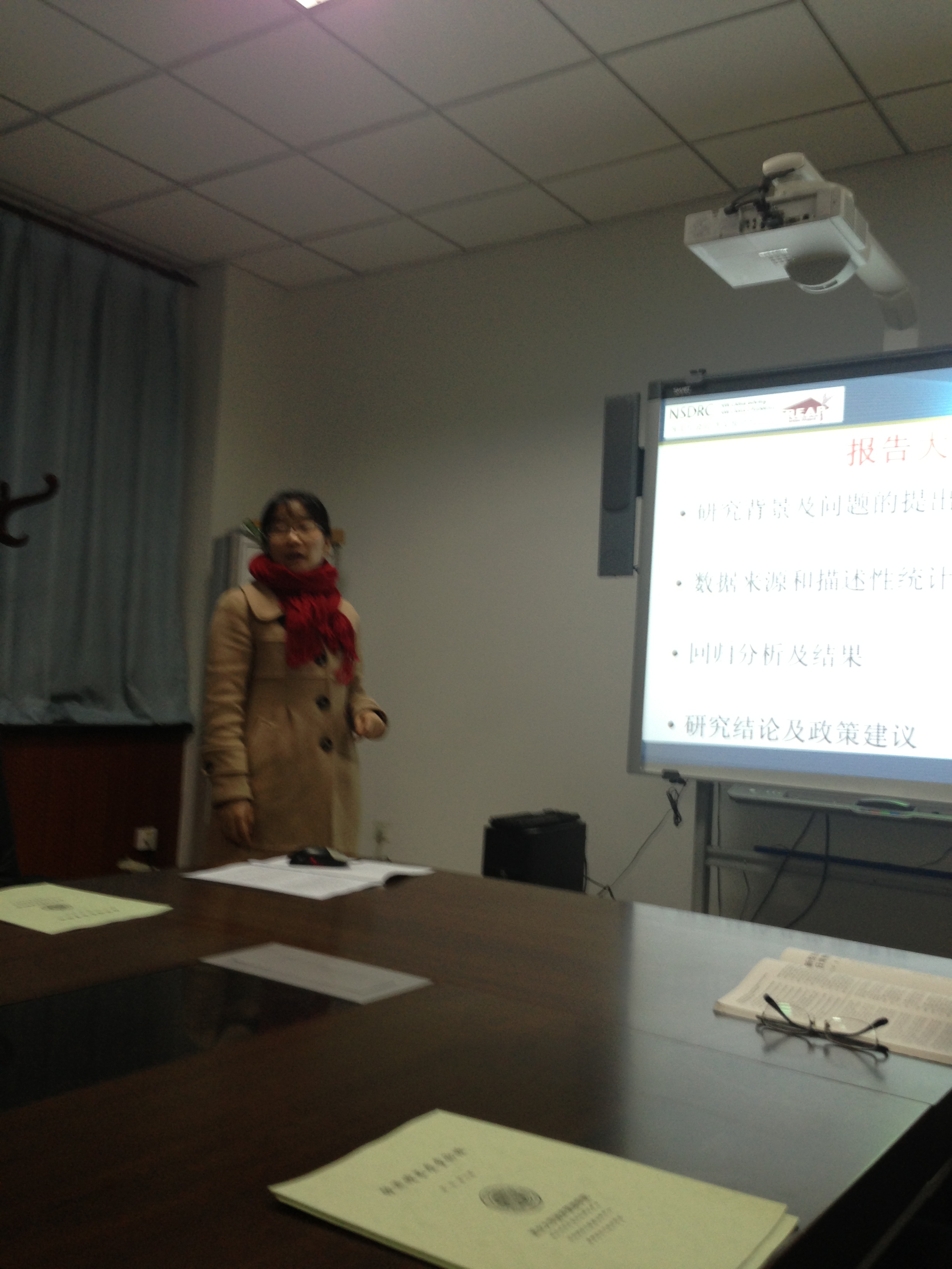 12月26日经济增长质量论坛第10期在长安校区经济增长质量研究中心举行。西北大学西北社会经济发展研究中心研究助理岳爱博士应邀作题为《新型农村社会养老保险对家庭日常费用支出的影响》的学术报告。776net必赢官网史耀疆教授、师博副教授、刘燕妮博士、安树军博士以及西北大学经济增长质量研究团队的博硕士和本科生参加了讨论。