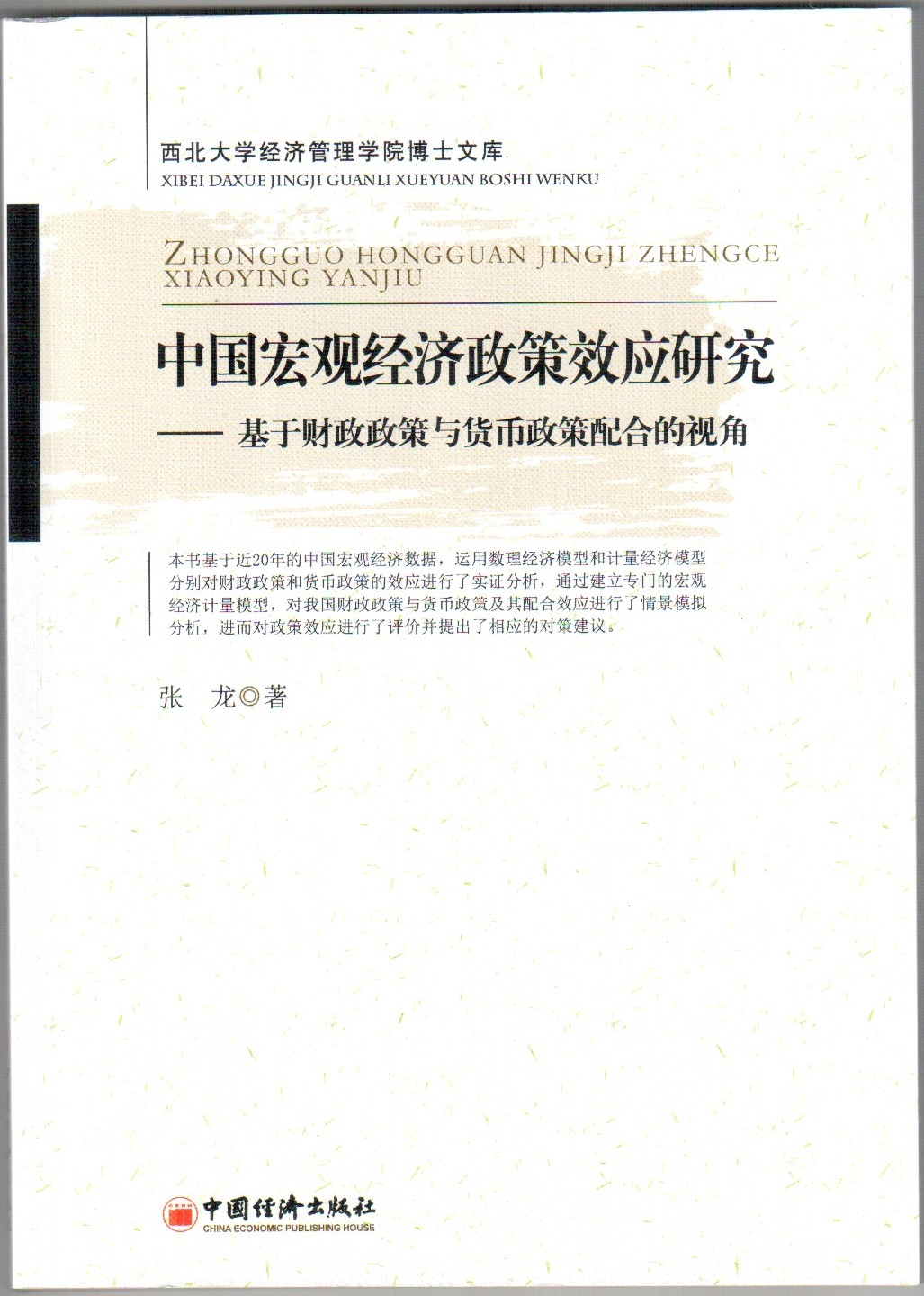 近日,我院数理经济与统计系张龙副教授的专著《中国宏观经济政策效应研究》由中国经济出版社出版,该书是我院陕西省重点学科西方经济学建设项目的研究成果。