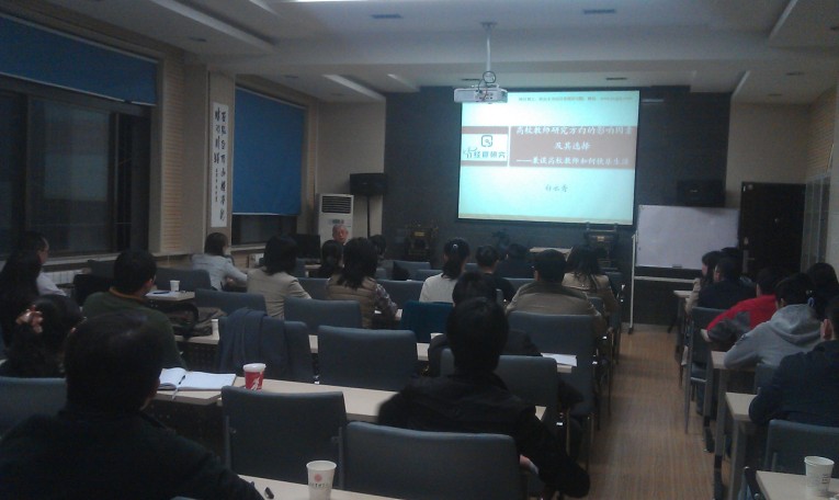 报告共分四部分:首先深刻阐述了三个观点“科研方向是高校教师职业生涯的平台”、“选择是成功的前提”、“专注是成功的保障”。其次,系统讲授了研究方向的影响因素,包括自身因素、工作因素、社会因素等。第三,结合自身的教学科研经历,阐述了选择方向就是选择一生幸福。第四,讲了五点体会。一是良好的心态是全家幸福的基础;二是自然是最高境界;三是无功利性就是快乐;四是双赢是团队可持续发展的条件;五是成功是奉献的结果。活动最后,白老师与青年教师就研究方向的选择、快乐生活进行了互动和交流。