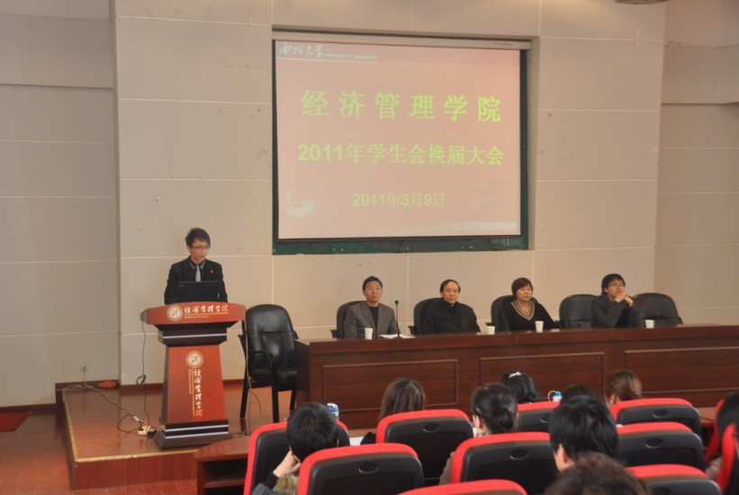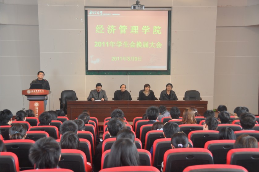 3月9日下午,776net必赢官网2011年学生会换届大会在金海报告厅举行,院党委书记薛来前、副书记樊涛,院团委书全体老师及学生会全体成员参加了本次会议,会议由院团委书记马金宝老师主持。