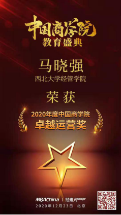 2020年12月23日,“2020中国商学院教育盛典”在北京隆重举行。我院MBA项目荣获“2020年度中国商学院最佳MBA项目TOP100”第43名,MBA/EMBA教育中心主任马晓强荣获荣获2020年度“中国商学院卓越运营奖”。