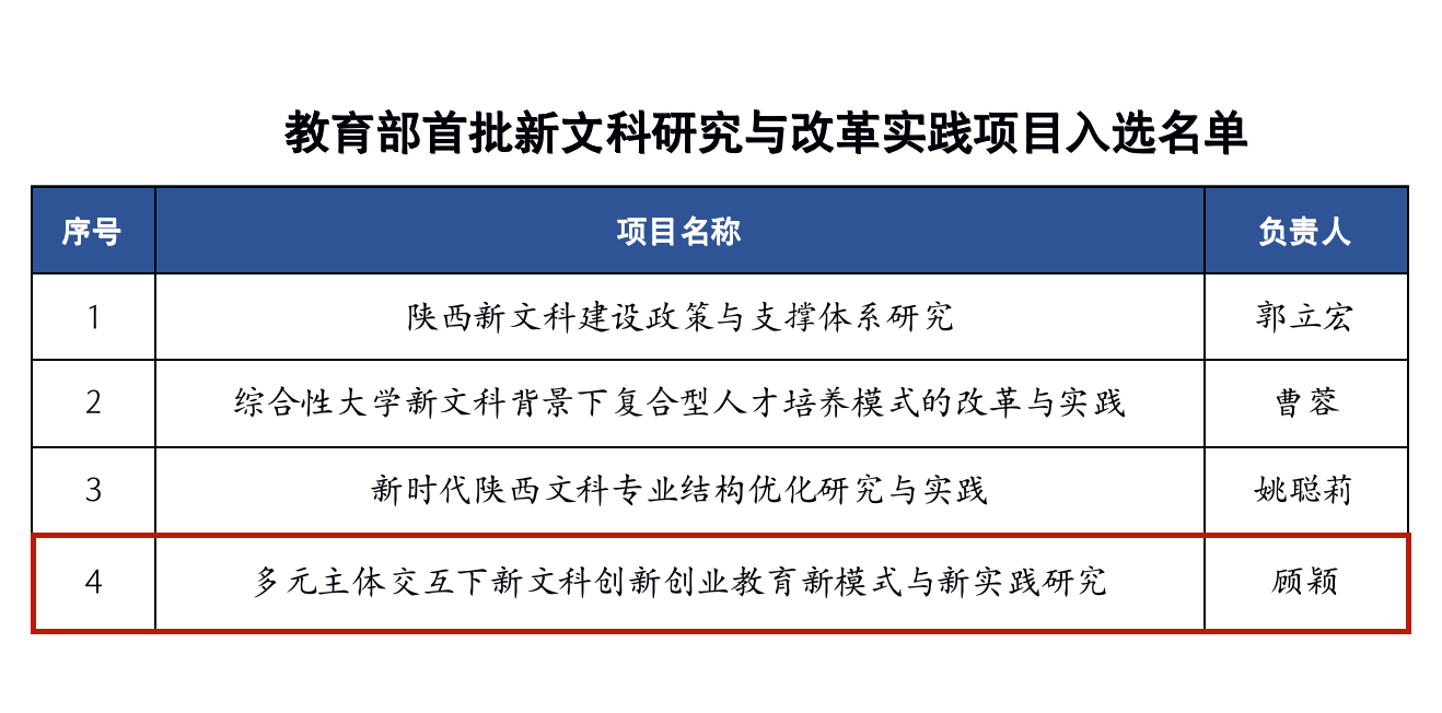 近日,教育部公布首批新文科研究与改革实践项目,我院顾颖教授负责的《多元主体交互下新文科创新创业教育新模式与新实践研究》项目入选,我校共获批4项。新文科研究与实践项目是贯彻全国教育大会精神,落实教育部新文科建设工作会议要求,全面推进新文科建设,构建世界水平、中国特色的文科人才培养体系的重要举措。学院将围绕“十四五”规划,全面深化教育教学改革,促进专业结构和课程体系的优化升级与交叉融合,完善本科专业人才培养方案,推动本科人才培养水平再提升。