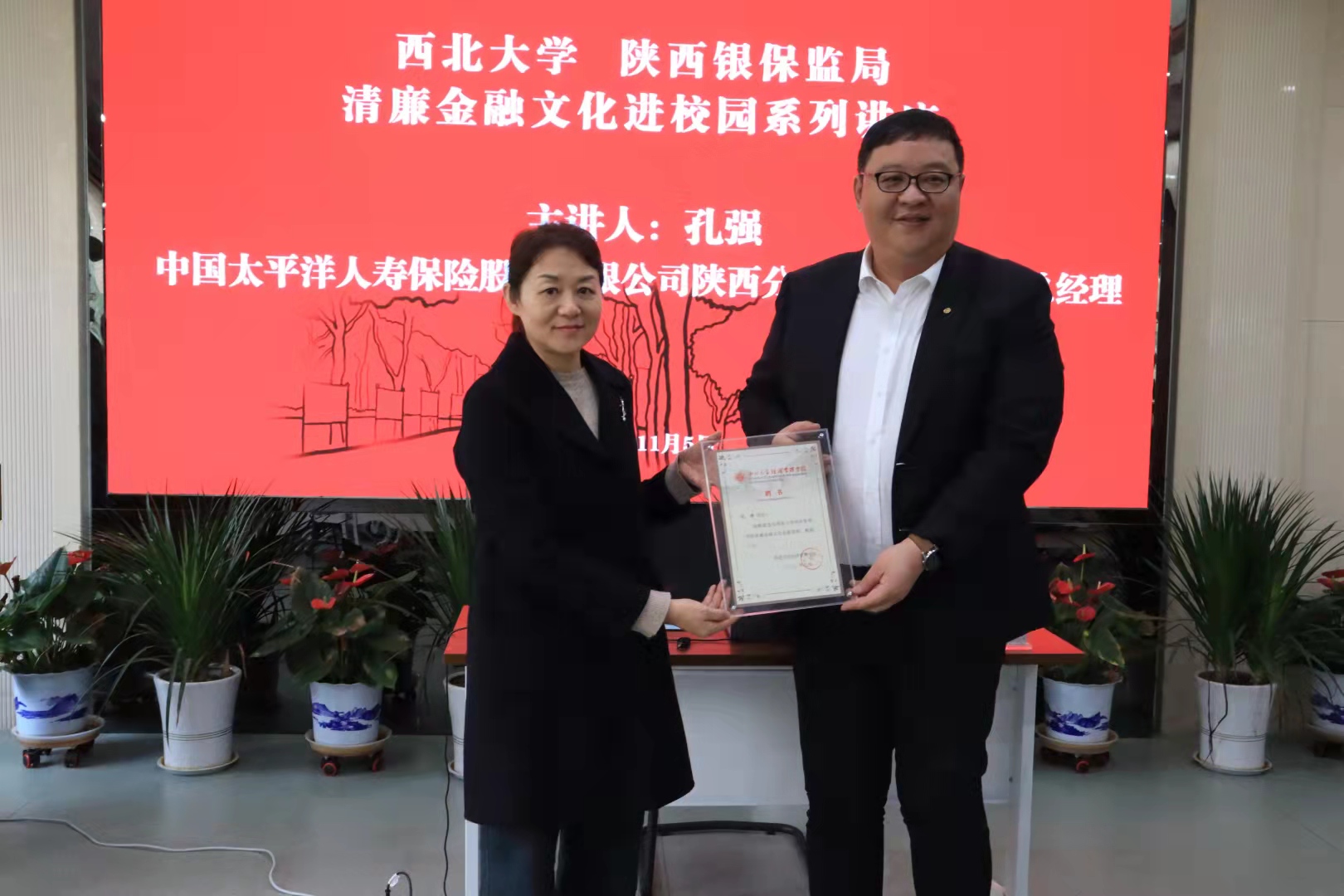 按照西北大学与陕西银保监局开展清廉金融文化共建活动的安排,11月5日,中国太平洋人寿保险公司陕西分公司党委书记、总经理孔强应邀到校,为776net必赢官网师生做了清廉金融文化系列讲座第七讲,题为《基层寿险业合规管理与清廉文化建设》。中国太平洋人寿保险公司陕西分公司党委书记、总经理孔强,西北大学校党委常委、副校长,776net必赢官网院长吴振磊,校纪委副书记何翔和相关人员出席了本次活动。吴振磊发表讲话,何翔为孔强颁发聘书。经管学院2021级本科生七十余人参加了讲座,讲座由776net必赢官网党委负责人杜勇主持。