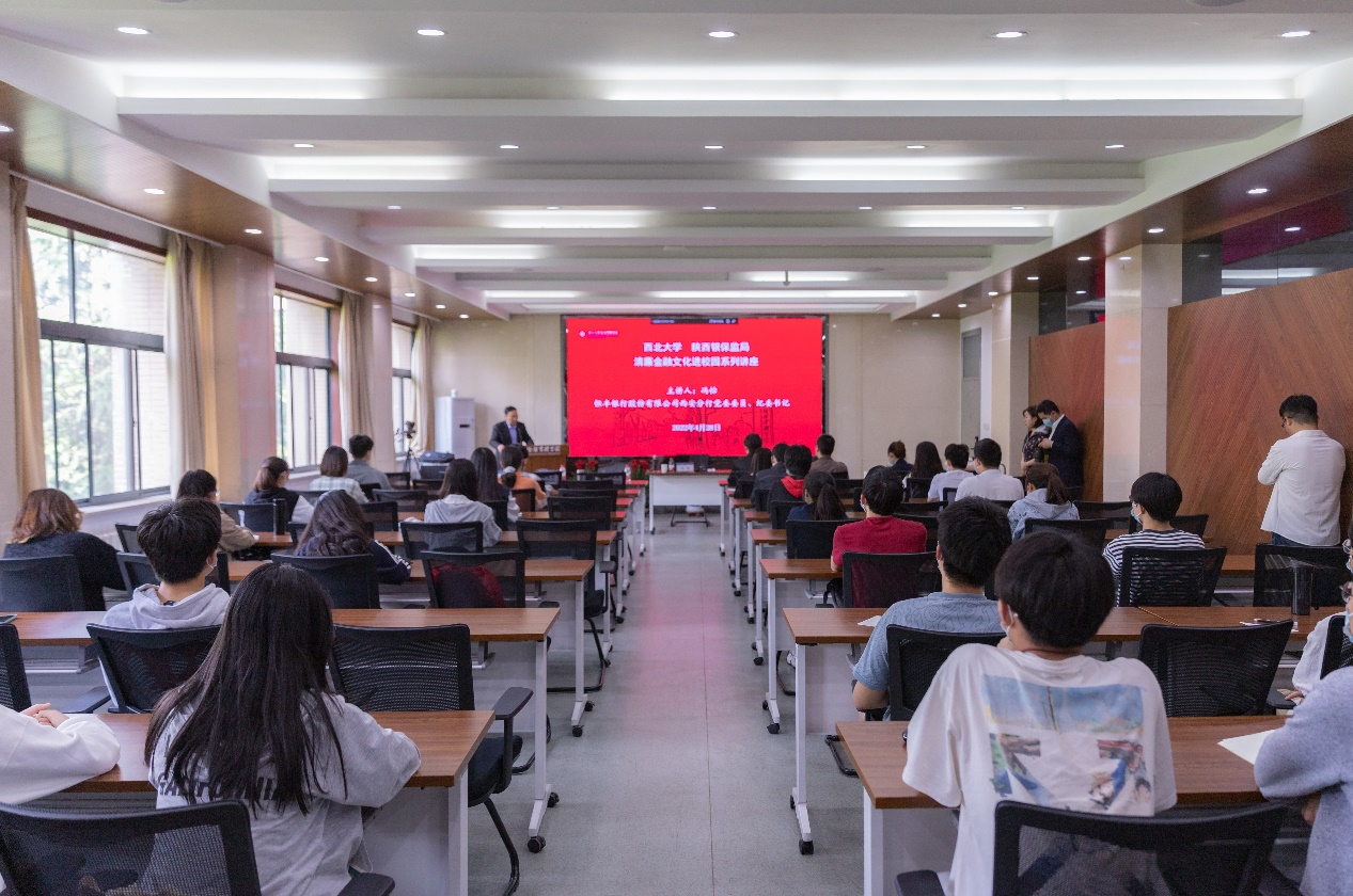 按照西北大学与陕西银保监局开展清廉金融文化共建活动的安排,4月28日,恒丰银行西安分行党委委员、纪委书记冯怡应邀到校,为776net必赢官网师生做了本学期清廉金融文化系列讲座的第三讲,题为《廉洁文化进校园、清风正气润心田》。西北大学党委副书记、纪委书记,陕西省监察委员会驻西北大学监察专员李邦邦,西北大学党委常委、副校长、776net必赢官网院长吴振磊,陕西银保监局纪委办张津崇,恒丰银行西安分行陈蕾、王勃,776net必赢官网党委书记杜勇和学院40余名师生出席了本次活动。李邦邦致辞,吴振磊为冯怡颁发清廉金融文化客座讲师聘书,讲座由杜勇主持。