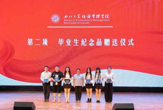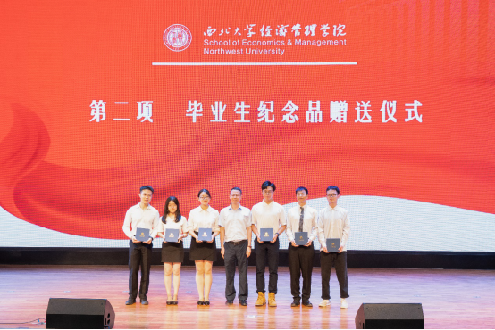 学院领导和各系教师代表向2022届本硕博毕业生代表赠送了精心准备的纪念品黑檀木书签一对、签字笔一支和全院师生大合影一张,书签上雕刻着学院原院长任保平教授亲手所书“潮涌海阔,千帆竞秀”的赠言,表达了学院对毕业生的殷切期望和祝福期许。