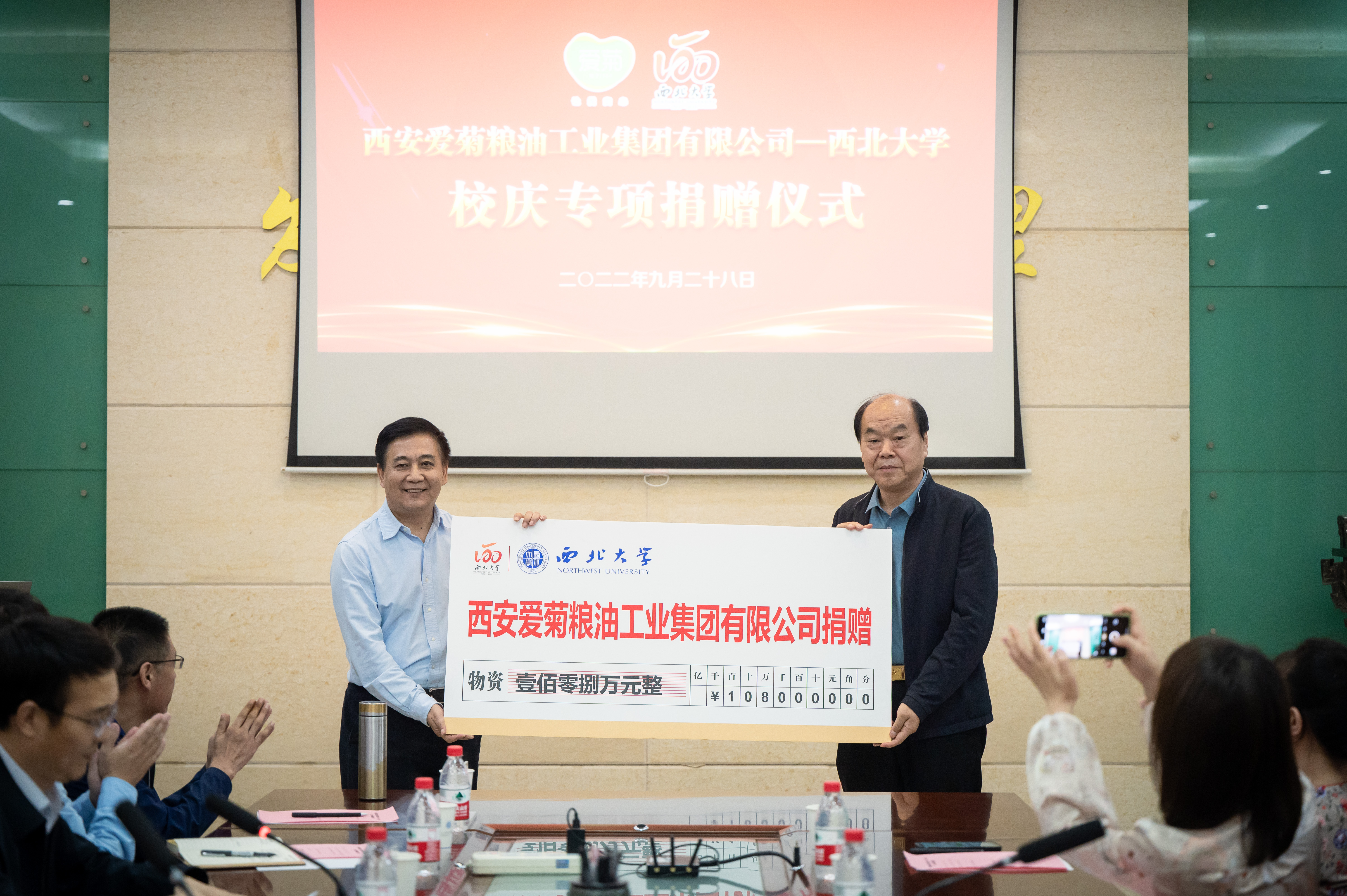 9月28日下午,西安爱菊粮油工业集团校庆专项捐赠仪式在我校长安校区举行。西安爱菊粮油工业集团有限公司董事长贾合义,副总经理刘东萌、贾婧,我校党委书记王亚杰,校党委常委、副校长吴振磊,校庆办常务副主任宁岗、校工会副主席陈小刚、国内处副处长张艺昆,学院党委书记杜勇、院长马莉莉及党政班子成员参加活动。捐赠仪式由校党委常委、副校长张远军主持。