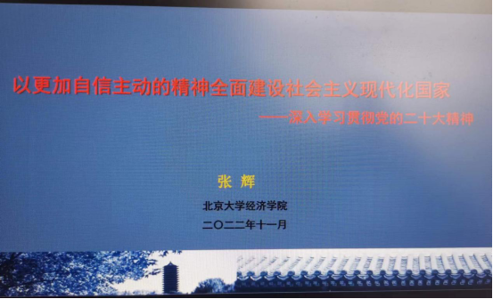 11月1日,北京大学张辉教授做了题为《以更加自信主动的精神全面建设社会主义现代化国家——深入学习贯彻党的二十大精神》的学术讲座。他从“一以贯之的主题:实现社会主义现代化”、“坚持历史自信:坚定不移地走中国式现代化道路”、“增强历史主动:在加快构建新发展格局中把握发展主动权”等三个方面对党的二十大精神进行了解读。他讲到,中国式现代化不仅是中华民族实现伟大复兴的必由之路,它更打破了“西方中心主义”教条。构建新发展格局就是要立足规模化优势,将我国经济发展的立足点由国际转向国内,通过超大规模的国内市场促进自身核心技术的创新、工艺的提升、品牌的形成,通过生产革新创造、引领、满足更多新层次、宽领域的美好生活需求,从而推动实现高质量发展。
