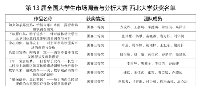 全国大学生市场调查与分析大赛连续五年入选高等教育学会学科竞赛榜单(A类),也被列入西北大学A类竞赛项目。大赛以服务国家战略需求为导向,与高校、企业建立紧密的人才培养机制。第十三届市调大赛本科组参赛学校851所、参赛学生21.5万。今年是我院第7次组织学生参赛,充分利用这一平台推进实践教学,引导学生深入开展具有时代特点的调查研究活动,坚持问题导向,增强问题意识,提升发现问题、解决问题的能力,在培养具有家国情怀、社会责任感、服务意识、市场敏锐度和团队协作精神的专业人才,推动教学改革等方面具有重要意义。