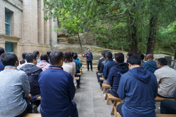 在杨家岭革命旧址,青年教师们参观了毛泽东旧居、朱德旧居、中共中央办公厅、中央大礼堂等革命旧址,一孔孔窑洞、一件件家具、一张张照片,无不映衬着革命年代领袖们在艰难困苦中闪耀着的红色光辉、思想伟力与精神信仰。在整个行程即将结束时,学院党委书记杜勇在中央大礼堂革命旧址前,结合本次革命圣地之行生动形象的给青年教师讲了一堂党课。