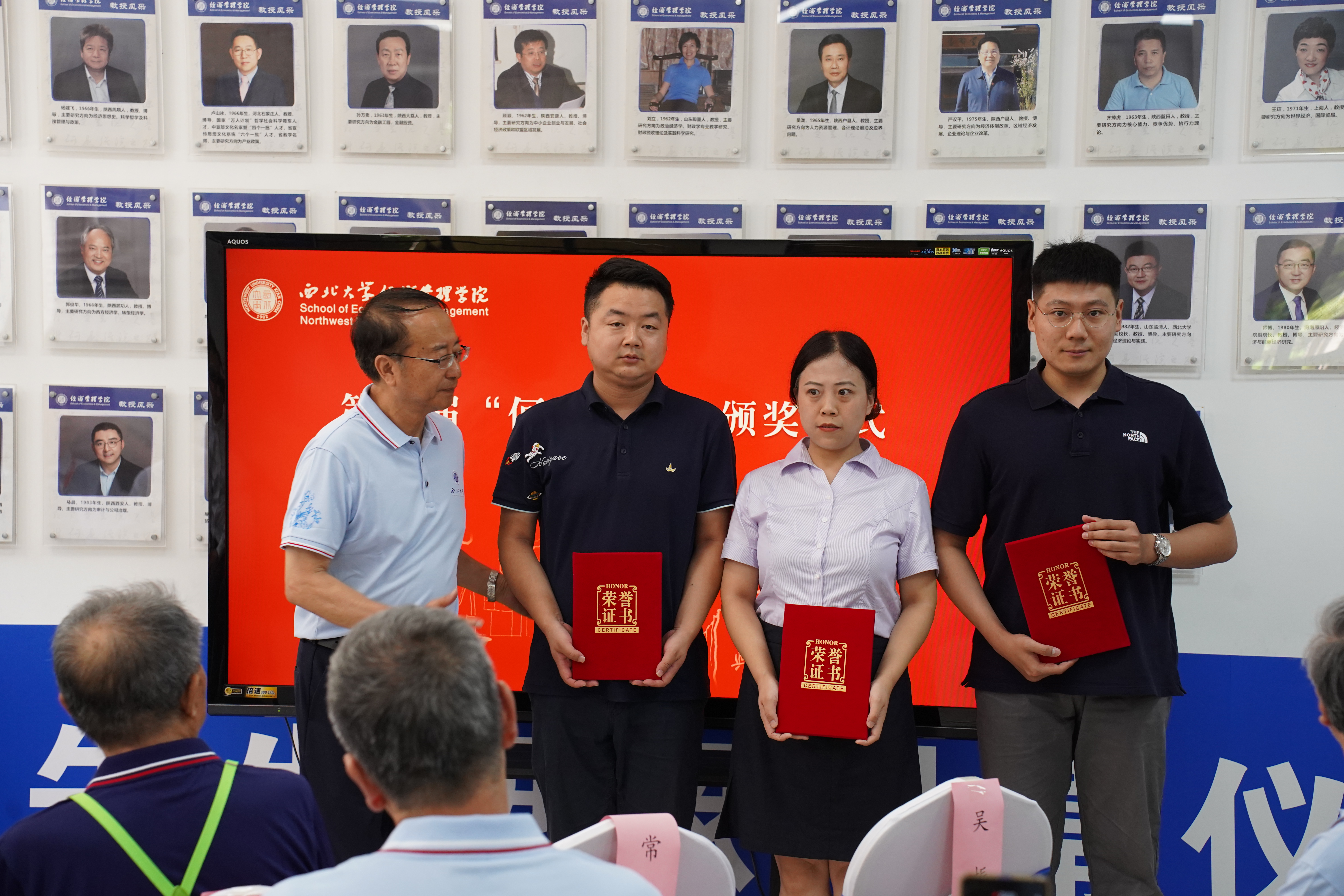 1977级校友杨立人为获奖青年教师及获奖学生颁发获奖证书。校党委常委、副校长吴振磊为获得荣誉奖的校友颁发获奖证书。