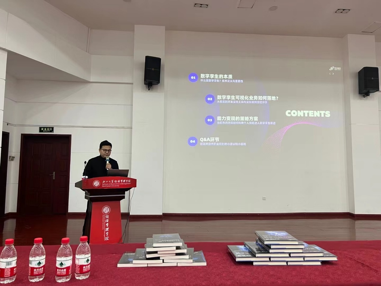 第一场讲座邀请了神州数码集团的高级三维设计师尧介绍了数字栾生可视化技术,他分享了数字孪生项目从售前、开发实施工具到最后落地的重要步骤及注意事项,介绍了神州数码的具体数字孪生项目,并从个人职业能力发展方面与同学们分享终身学习的态度和永不放弃的心态。