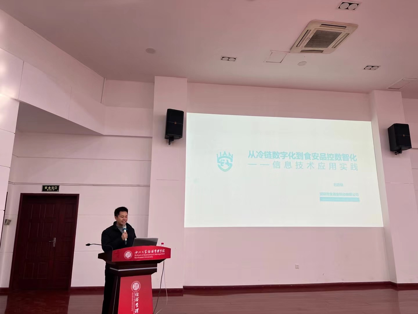第三场讲座邀请了G7易流-食易安科技有限公司副总经理石忠佳,他向同学介绍了数字化在冷链业务中的应用,并且深入食品安全场景,从“数智化”视角看食品安全,通过具体案例介绍数智化对企业的价值。