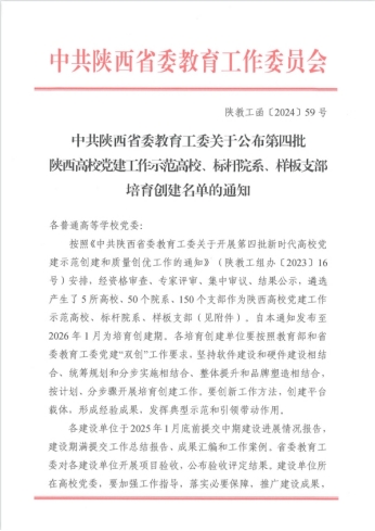 近日,省委教育工委公布了第四批陕西高校党建工作示范高校、标杆院系、样板支部培育创建名单。我院党委入选全省党建工作标杆院系培育创建单位名单。截至目前,我院已有1个党支部入选“全国党建工作样板支部”培育创建单位名单,2个党支部入选全省高校党建“双创”样板支部建设名单。