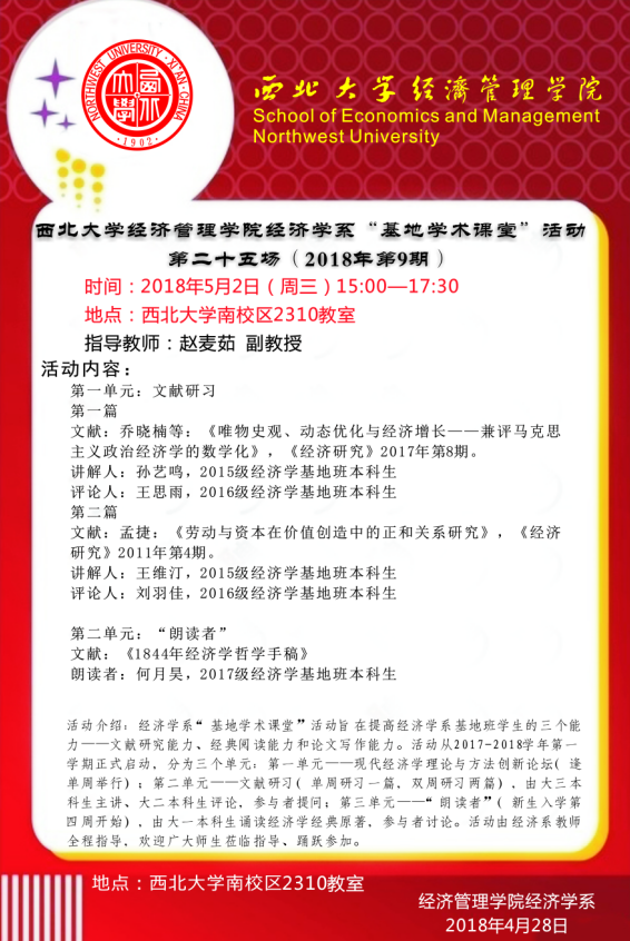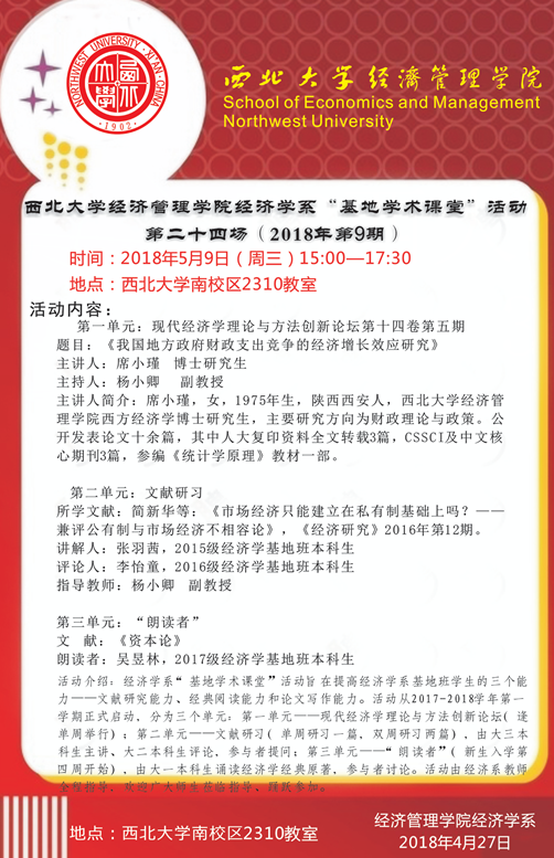 西北大学776net必赢官网经济学系“基地学术课堂”活动第二十五场(2018年第9期)
