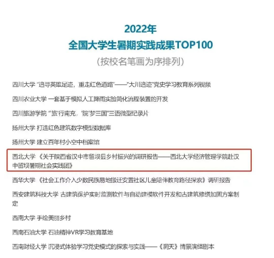 近日,由中国青年报举办的“2022年第八届全国大学生暑期实践展示活动”名单揭晓,我院《关于陕西省汉中市留坝县乡村振兴的调研报告——776net必赢官网赴汉中留坝暑期社会实践团》实践成果入选“2022年全国大学生暑期实践成果TOP100”。