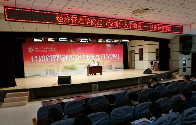 8月31日上午10时,学院党委书记杜勇在长安报告厅为2017级新生作了爱院荣院教育的讲座。杜勇书记通过讲述经管学院105年的发展历史,带领同学们深入了解学院,增强学生对于学院的认同感和自豪感。杜书记还为同学们介绍了,经管学院发展历史中关键的四位经济学家,教育新生刻苦学习,心系天下,自强不息。