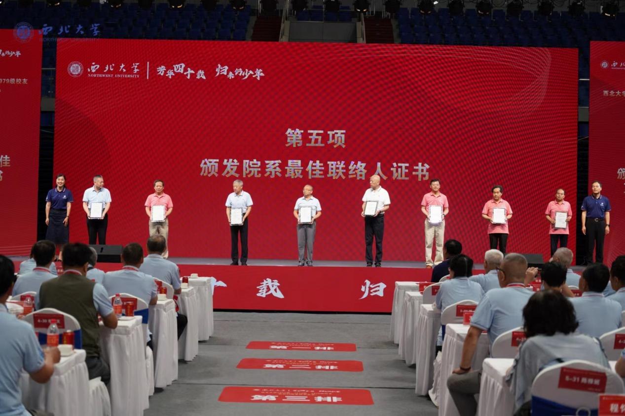 在返校期间,经济系77、78级校友还参加了“新三届”校友毕业40周年纪念大会暨第四届校友集中返校活动。纪念大会上,77级高全成、78级李树民两位校友获颁“院系最佳联络人”,77级吴世科校友接受拨穗并获赠蓝田玉印,78级丁文锋校友为经管学院老教师代表樊正棠献花。77级、78级校友还召开了座谈会。