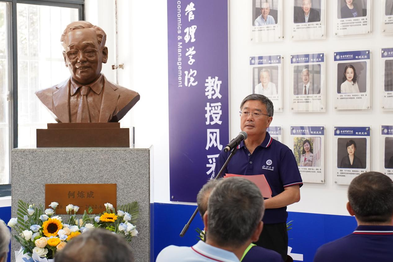 活动最后,郭立宏校长发表讲话,他指出,何炼成先生是孜孜不倦的学术家,在学术研究上身先士卒,高瞻远瞩,是矢志不渝的领跑者,是出神入化的教育家,教学方法独到,引人入胜,教学态度严谨求实,循循善诱,是西大精神的忠诚践行者和生动诠释者,先生到西北大学以来,极其刻苦、勤奋,在非常艰苦的条件下,他亲历和推动了西北大学经济学科一次又一次的辉煌。他希望在何老师的凝望中,经管学院广大师生要赓续优良传统、勇担时代使命,踔厉奋发、勇毅前行,为推动经济学科和学校事业高质量发展贡献更大力量。