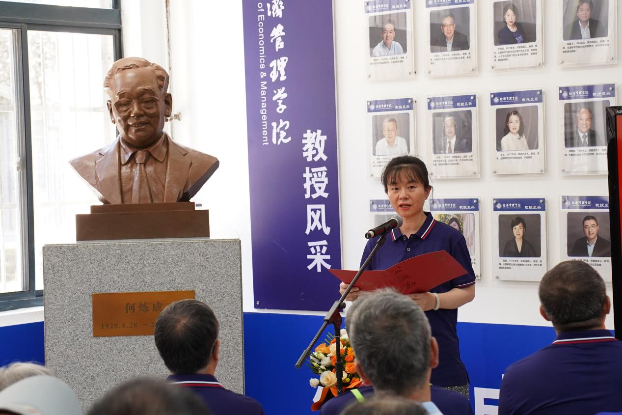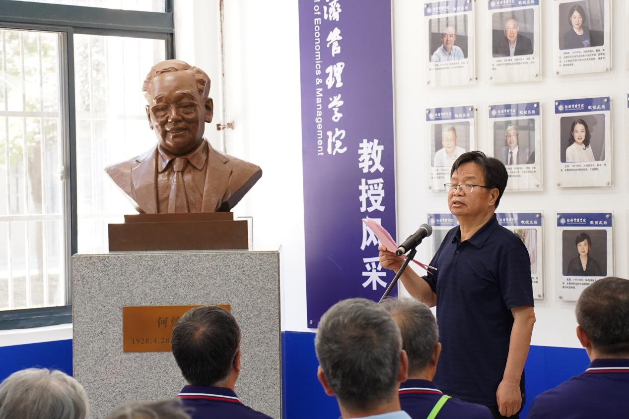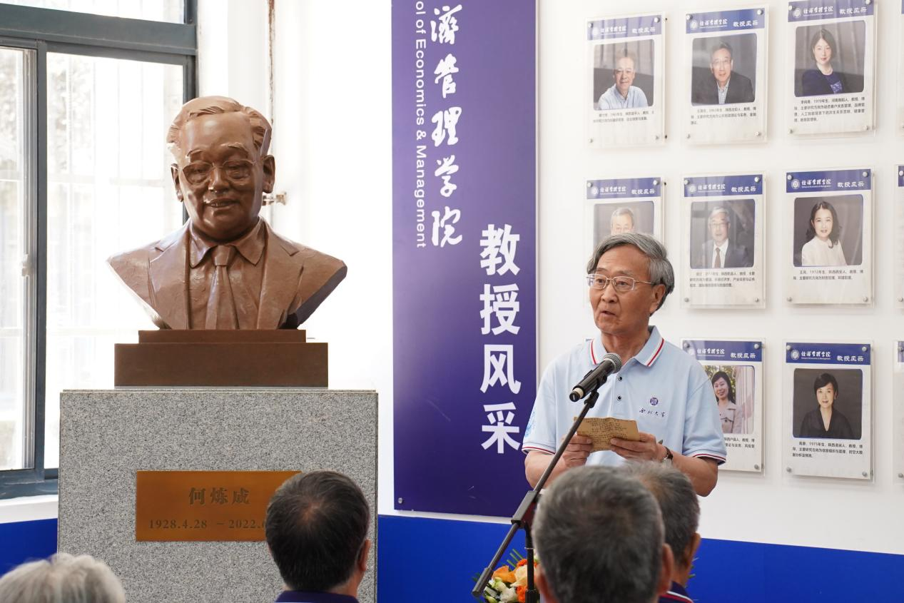 经济系77级杨立人校友发言表示,要学习先生“不唯上、不唯书、只唯实”的实事求是精神,学习先生一丝不苟、兢兢业业、认真负责的工作精神,学习先生埋头苦干、孜孜不倦、刻苦钻研的奋斗精神,学习先生博采众长、启智容错、激励思辨的教育精神,学习先生与时俱进、为国为民、创新立言的奉献精神。经济系78级刘旨贤校友代表全班深情诵读了自己创作的《何师铜像 揭幕吟唱》,表达了全班对何先生的深情怀念。经济系77级张维迎校友演唱自创信天游,一曲《何老师再听我一曲信天游》道尽了老师对学生的关心和扶持,倾诉着学生对老师的感怀和思念!经济系77级曾宣传校友诵读自创铭文,铭文以“悠悠长安,教泽汤汤。西大文昭,恩师宏光”起始,以“瞻念师范,慨当以慷。激励来者,学脉绵长”结尾,以抒缅怀。经济系77级叶世铭校友诵读对联:“炽烈情智源湘浏,铮骨铸就;绚烂文章涵磊襟,碧血炼成”,以表敬意。