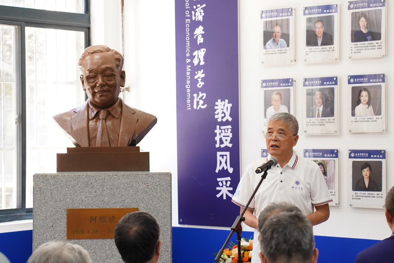 7月15日上午,776net必赢官网举办了何炼成先生塑像揭幕仪式暨第十届“何炼成奖”颁奖仪式。何炼成教授是我国著名经济学家、教育家,中国发展经济学奠基人之一,776net必赢官网创始人。西北大学校长郭立宏,副校长常江、吴振磊,77级、78级经济系校友及何炼成先生家人,776net必赢官网班子成员和师生代表70余人参加揭幕仪式。何炼成先生铜像由以张维迎教授为代表的77级经济系同学共同捐赠。